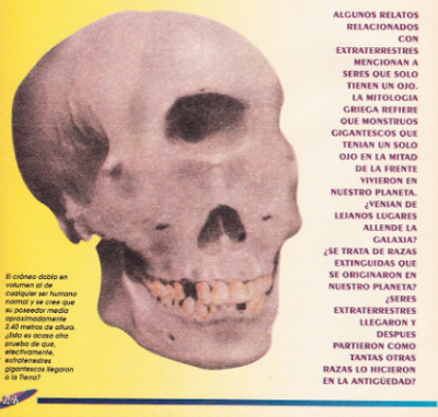 Lo anterior me hizo recordar que la señora Zita Rodríguez Montiel publicaba, en su revista Reporte OVNI (ésta comenzó a publicarse en 1993, aparecía quincenalmente y se publicaron 62 números; una vez que esta revista desapareció, la misma editorial publicó Contacto OVNI, que tuvo varios directores, la mejor época fue cuando la dirigió Óscar García), artículos del mencionado tabloide, como la historia del cráneo de un cíclope.