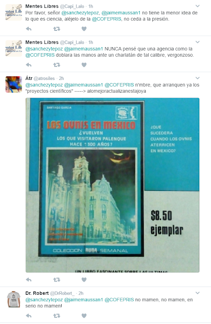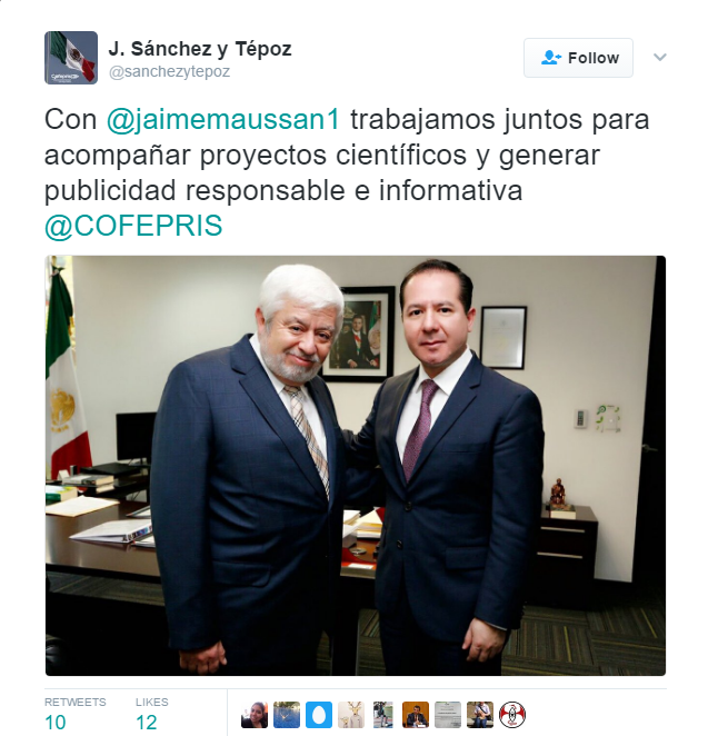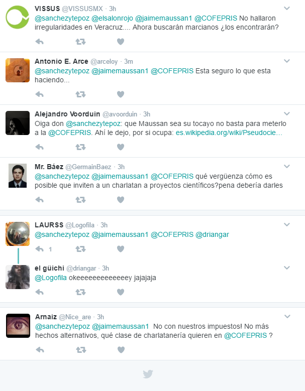 El primer tuit de Sánchez y Tépoz, como se ve, hizo que muchos pensaran que la Cofepris buscaba a Maussán para convertirlo en asesor de la misma (parte de la confusión se debió al desconocimiento del contexto en el que se relizó la reunión, es decir, desconocían las notas aparecidas en algunos diarios y la reacción de Maussán en su programa de televisión). Los siguientes tuits no aclararon mucho la situación, por lo que la gente seguía criticando tanto a la Cofepris como a Maussán. Lo que llevó al Comisionado Federal de la Cofepris a escribir el siguiente mensaje: