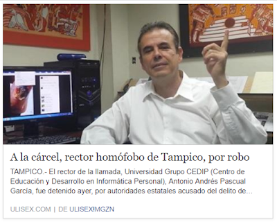 Ayer leí la siguiente información en la página Ulisex!: "El rector de la llamada, Universidad Grupo CEDIP (Centro de Educación y Desarrollo en Informática Personal), Antonio Andrés Pascual García, fue detenido ayer, por autoridades estatales acusado del delito de robo de vehículo, inmuebles y despojo de un predio propiedad del finado líder petrolero Joaquín Hernández Galicia, mejor conocido como “La Quina” (...) Pascual García, fue llevado a la cárcel municipal donde dijo sentirse mal de salud, para luego ser trasladado a un hospital donde su esposa, quien es catedrática de la misma Universidad CEDIP, agredió a policías, en la exigencia de atención médica a su marido, por lo que fue sacada del hospital."